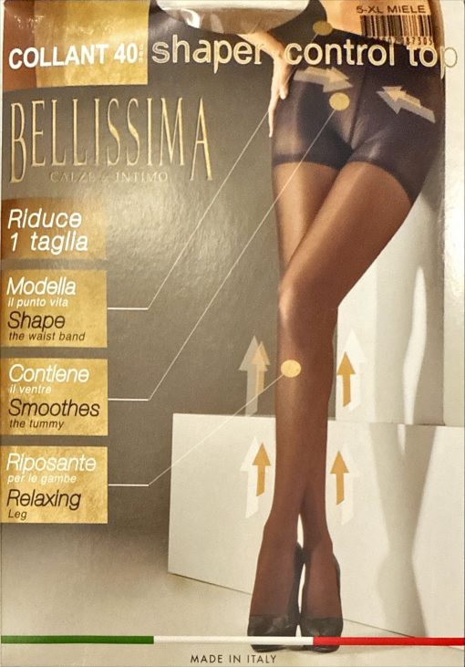 - Bellissima B35 Control Top 40 harisnya, mely a csípőt 1 mérettel kisebbre veszi. Nadrágrésze erősebben gumírozott, hosszított erősítéssel készült, így a combot is szorítja (molettebb hölgyeknek is előnyös).