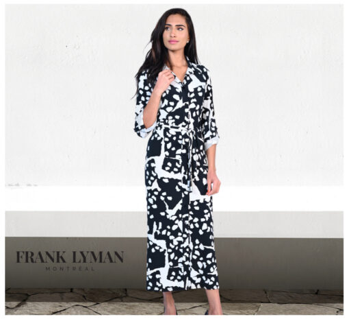 Kategóriák: Alkalmi ruha, Egybe ruha, fehér, fekete, Frank Lyman, galléros, gombos, hosszú ujjú, mintás