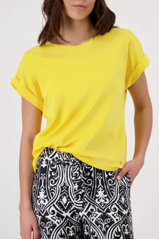 Ez az egyszerű póló 100% pamutból készült, rövid, leengedett ujjakkal és mandzsettával.