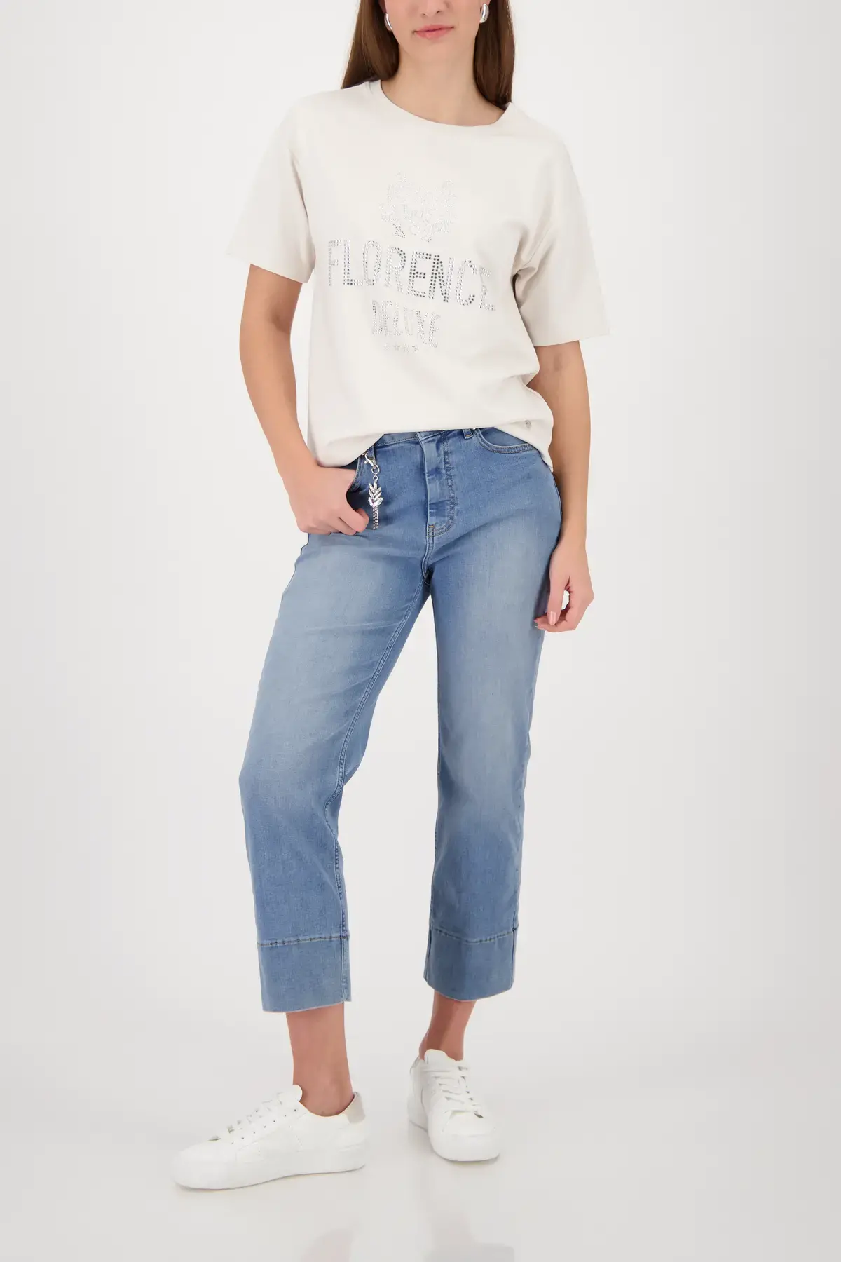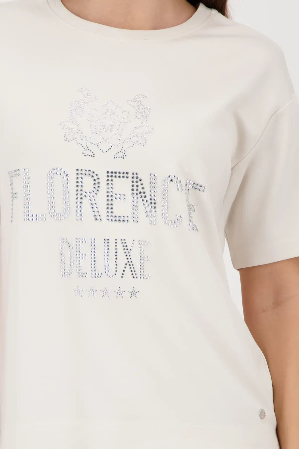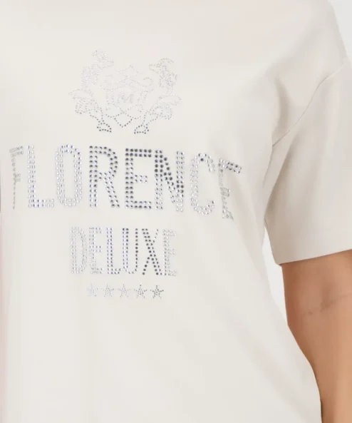 Szuper puha póló strasszokkal díszített felirattal és kerek nyakkivágással, stílusos felső mindennapi viseletre.