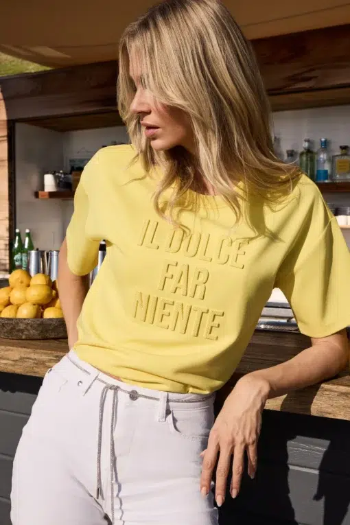 Elegáns, lenge viszkózból készült, rugalmas anyagú póló, kerek nyakkivágással és csillogó dombornyomott felirattal. Tökéletes magabiztos megjelenéshez.