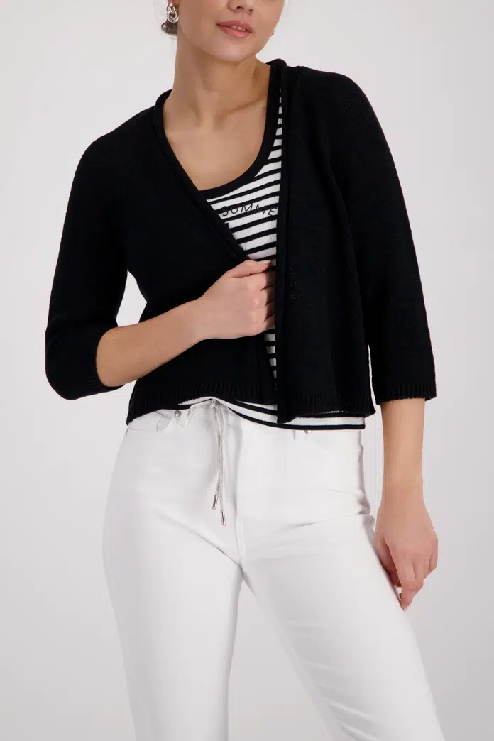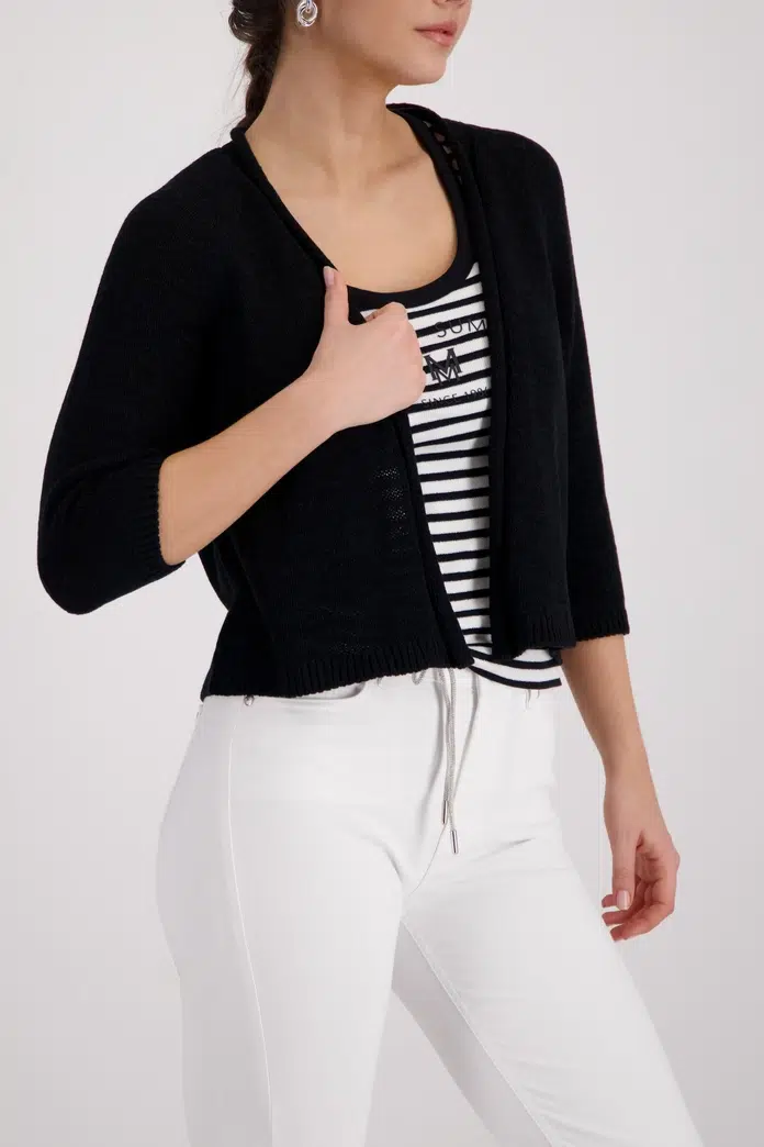 Ez a kardigán otthonos hangulatot kölcsönöz bármilyen öltözéknek. ¾ raglan ujjakkal és kapcsok nélkül.