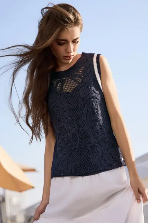 Elegáns kötött pulóvermellény 100% viszkózból, művészi Cornelly mintával díszítve, talp nélküli ujjakkal.