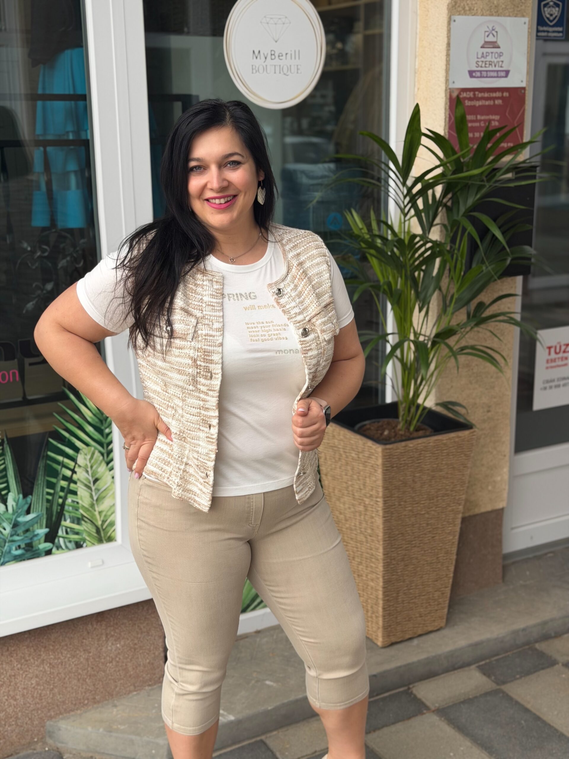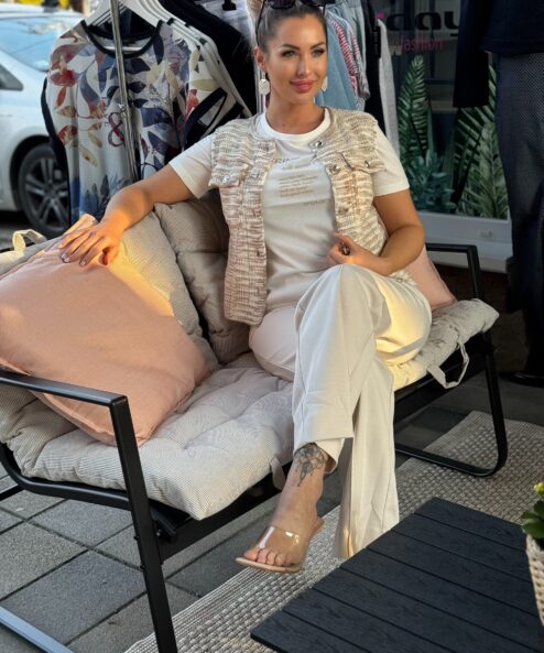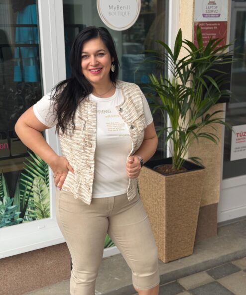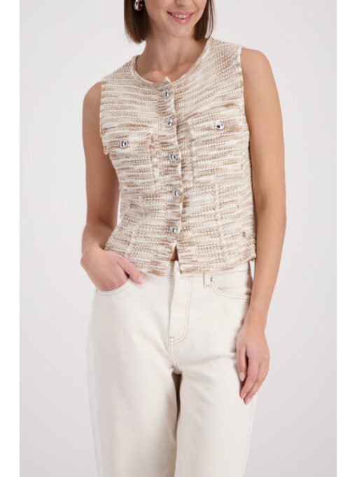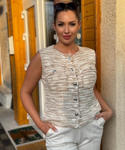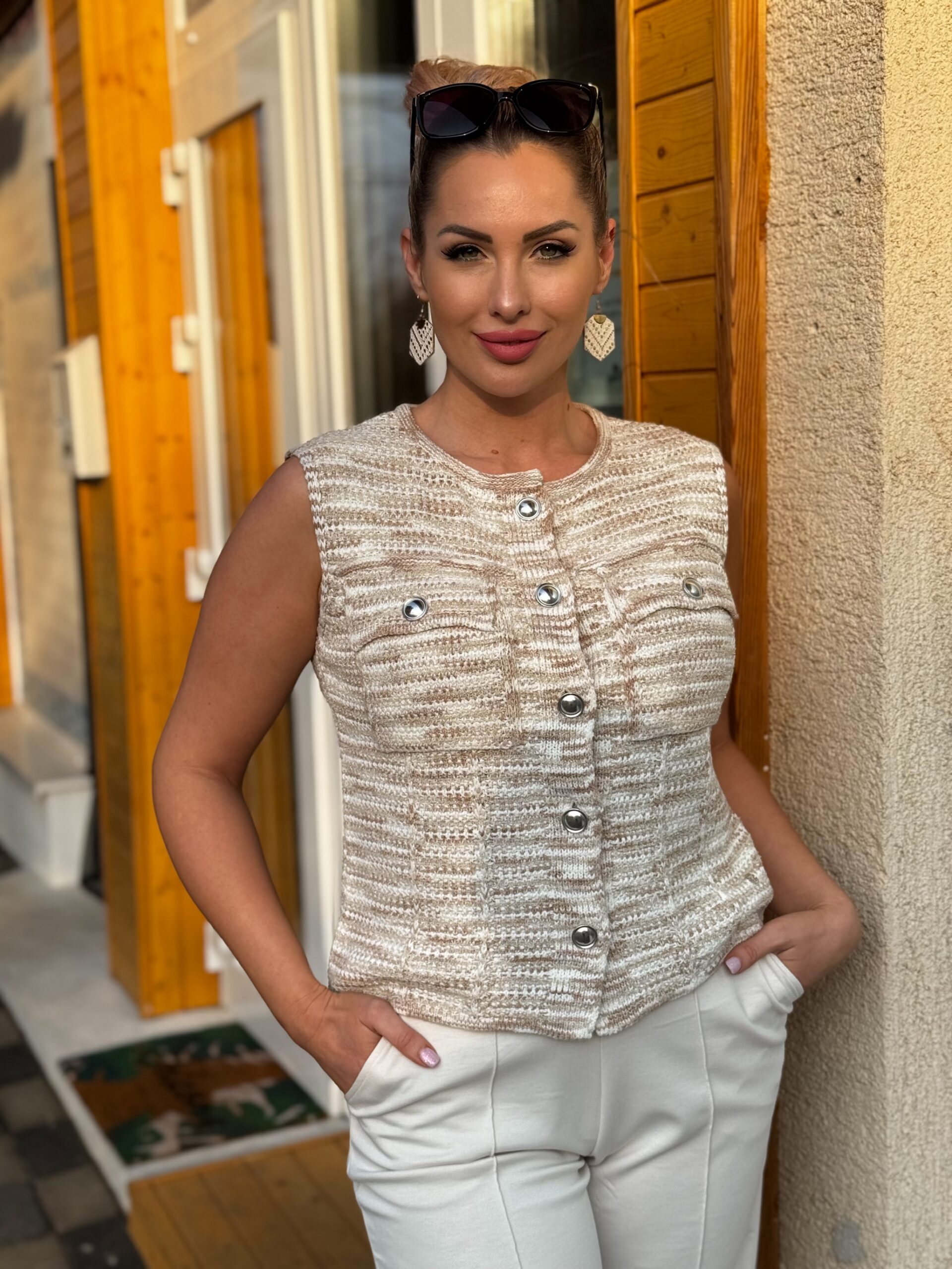 Elegáns kötött mellény kiváló minőségű anyagokból, fényes lurexszel és stílusos textúrák keverékével díszítve.