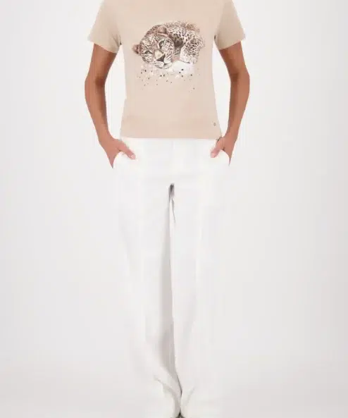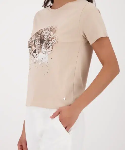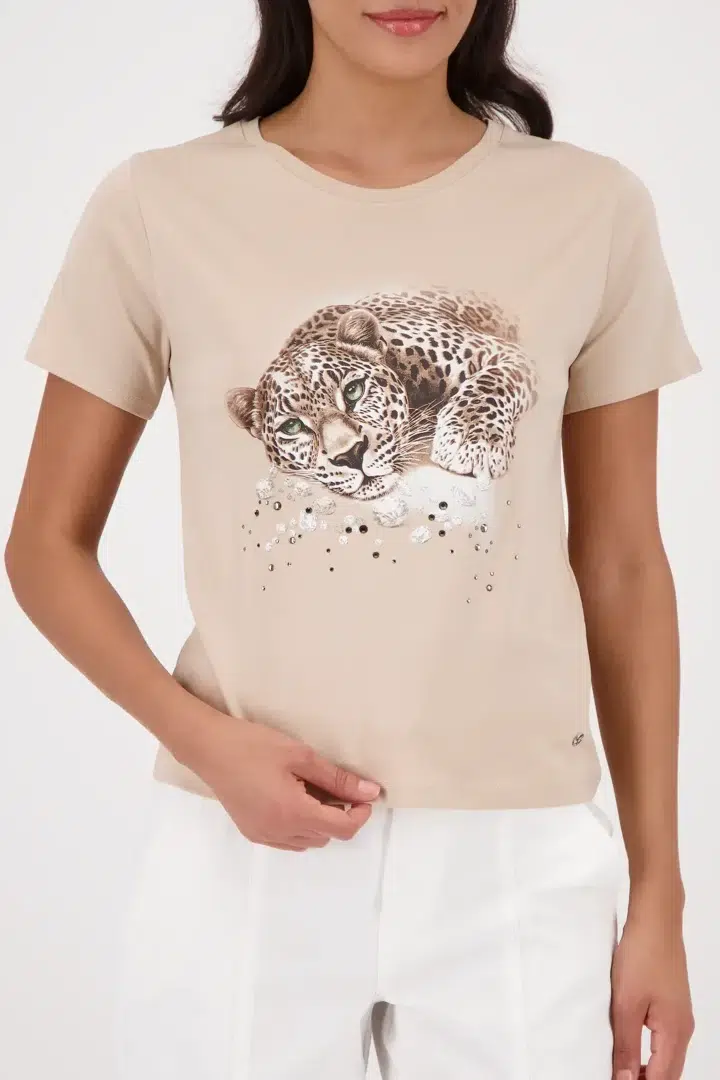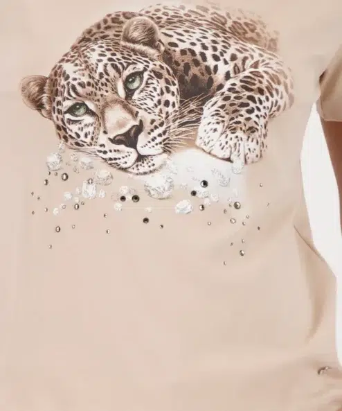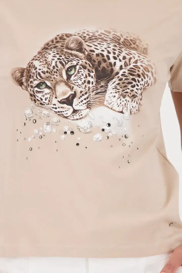 Ez a kényelmes, 100% pamutból készült poló egyszerű leopárd mintával és strasszokkal,