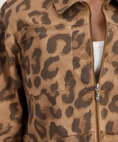 Ez a stílusos, rövidített, leopárdmintás kabát kiváló minőségű pamutból készült, ¾ hüvelykujjal, ami a strapabíró anyagot elegáns részletekkel ötvözi.