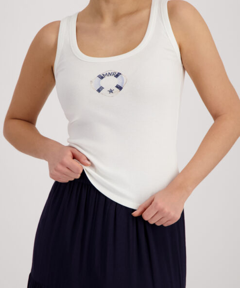 Elegáns felső kiváló minőségű pamutból, rugalmas anyaggal és bordázott szegéllyel, csillogó strassz mintával díszítve. Tökéletes a strandra.