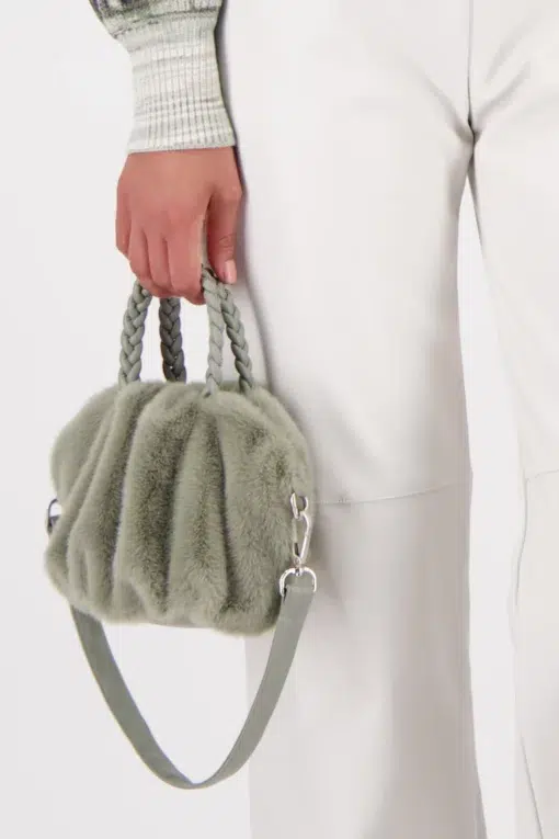 Elegáns műszőrme táska bolyhos textúrával, csillogó strasszokkal a fogantyún és praktikus patentgombos záródással – stílusos, kötelező darab!