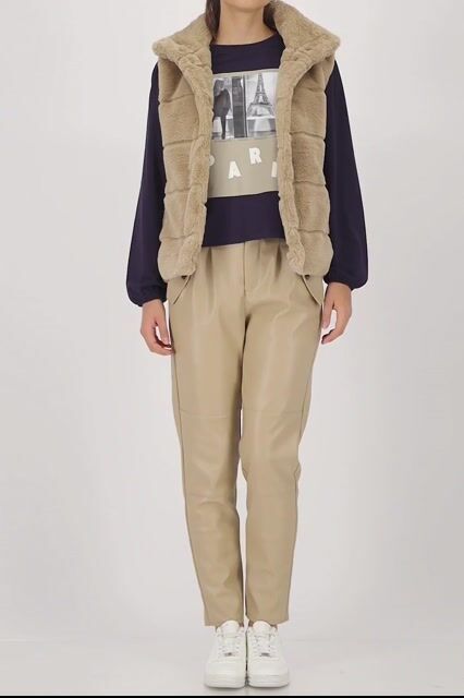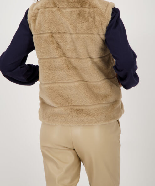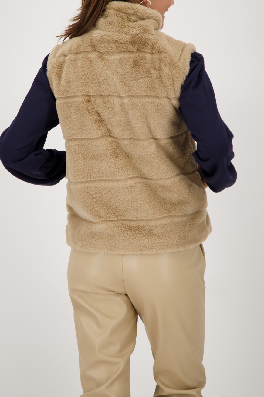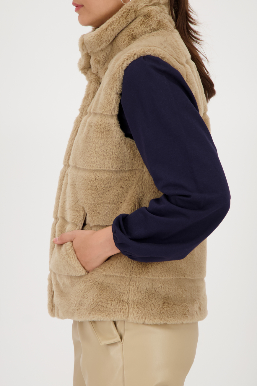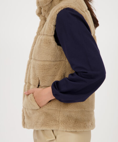 Luxus műszőrme mellény bolyhos textúrával, állógallérral, oldalsó zsebekkel és praktikus, kétirányú cipzárral. Tökéletes a stílusos megjelenéshez.