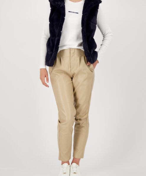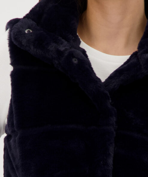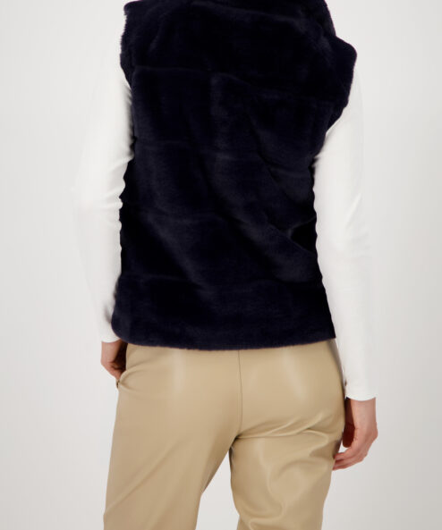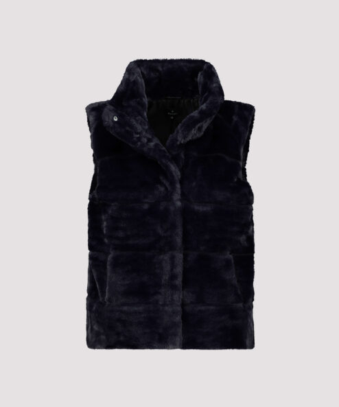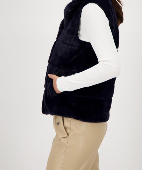 Luxus műszőrme mellény bolyhos textúrával, állógallérral, oldalsó zsebekkel és praktikus, kétirányú cipzárral. Tökéletes a stílusos megjelenéshez.