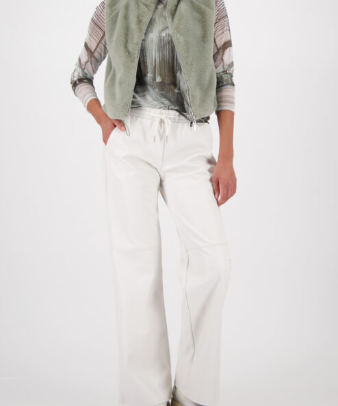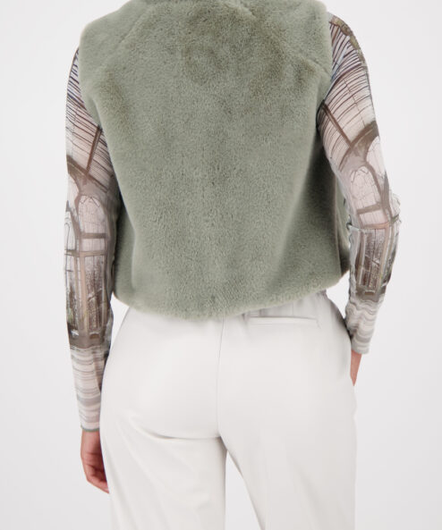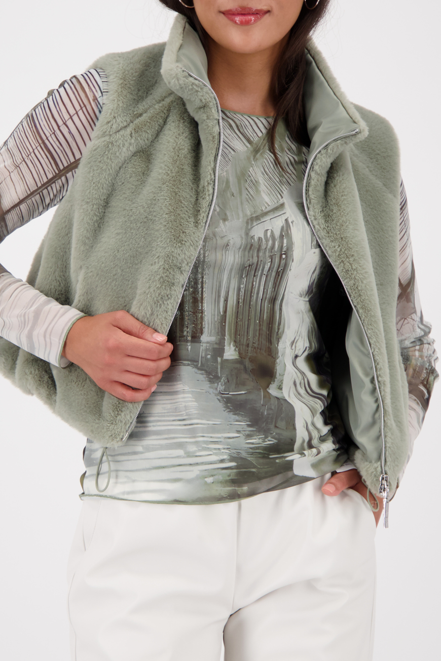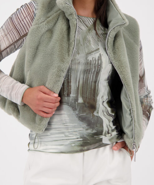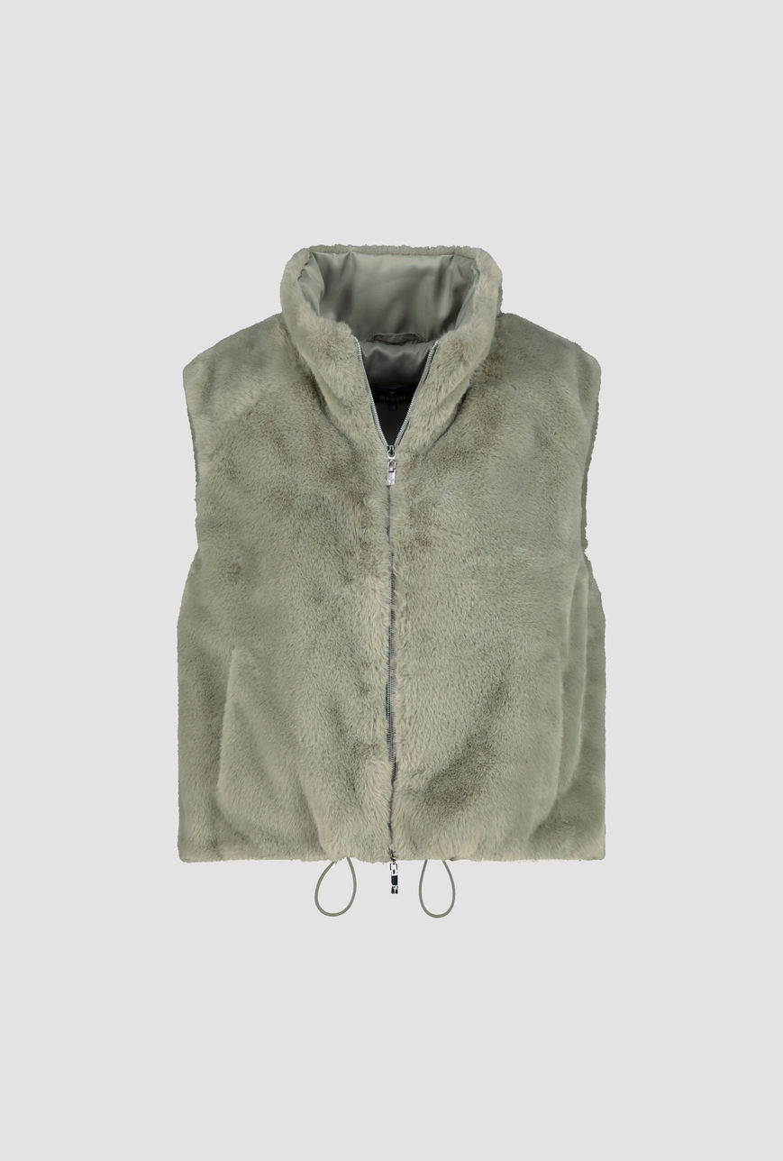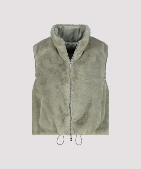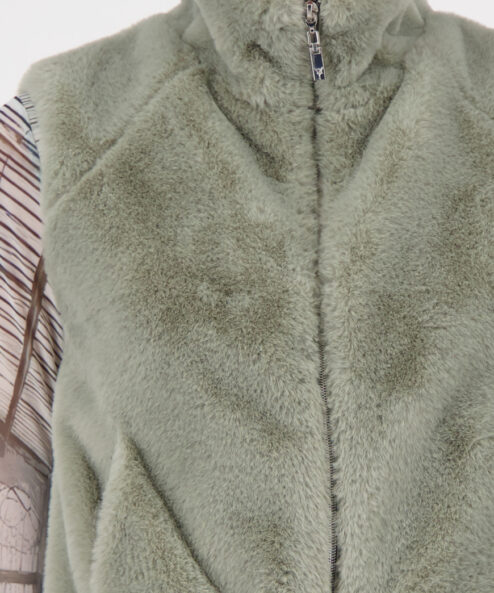 Luxus műszőrme mellény bolyhos textúrával, állógallérral, oldalsó zsebekkel és praktikus, kétirányú cipzárral. Tökéletes a stílusos megjelenéshez.