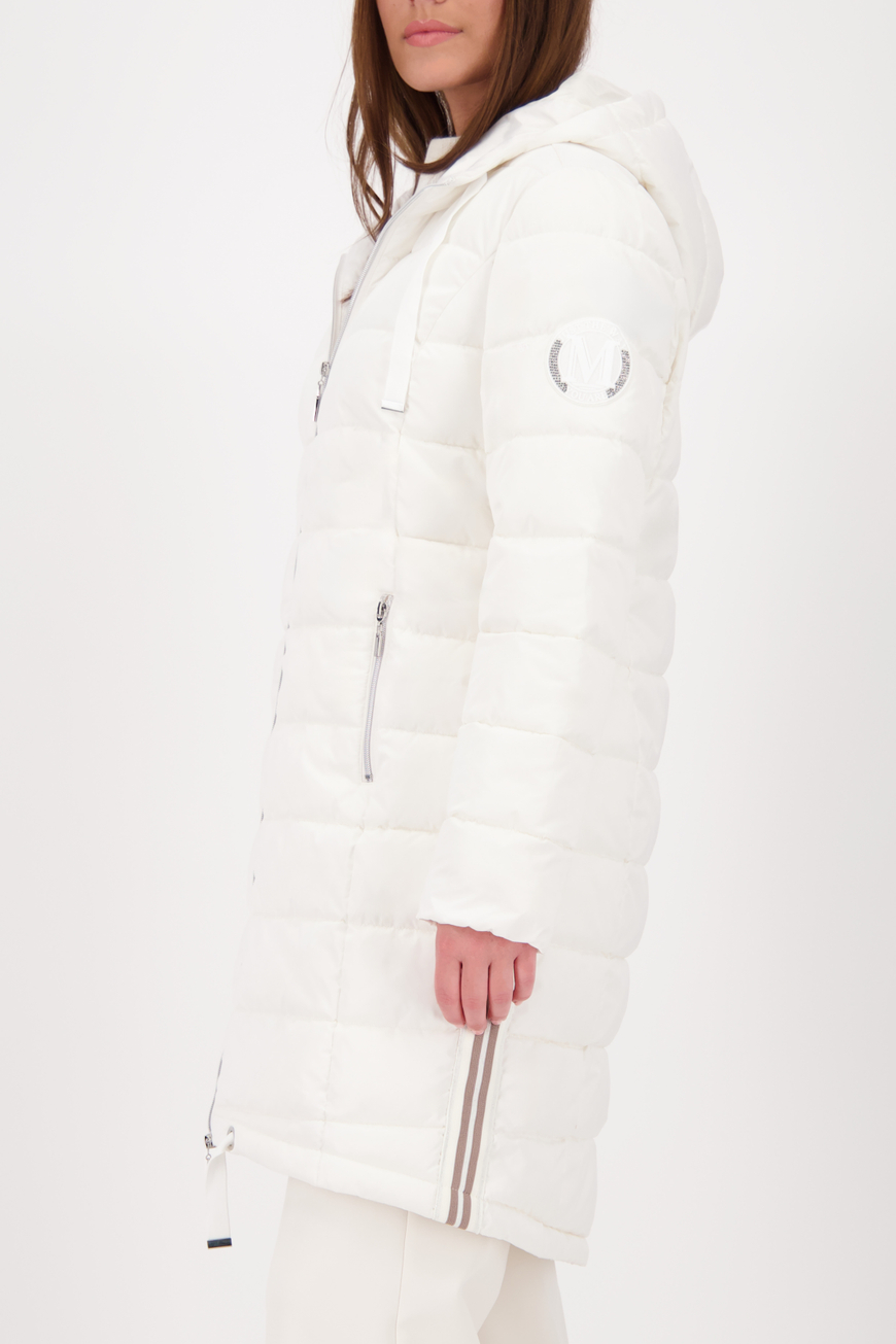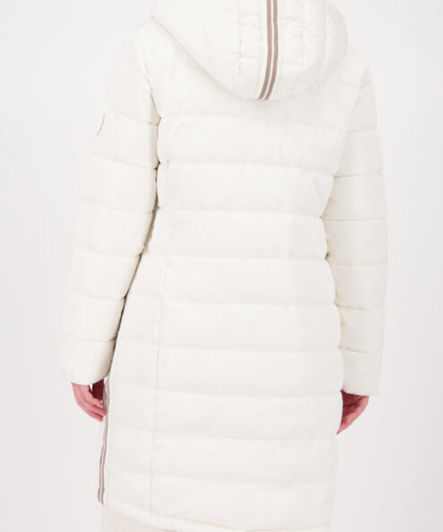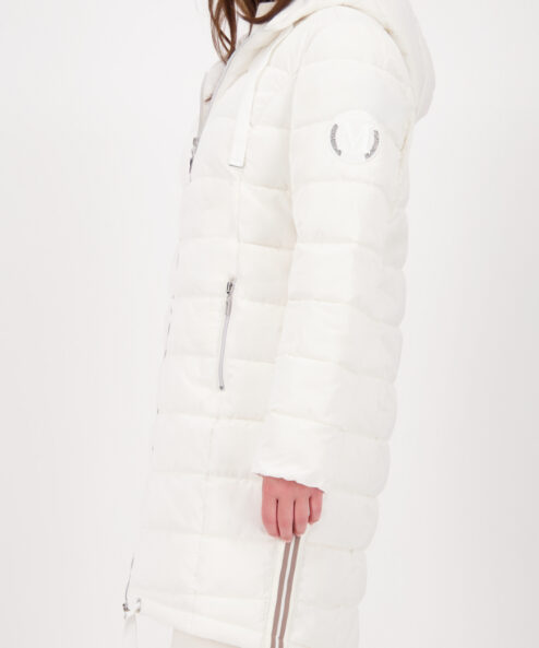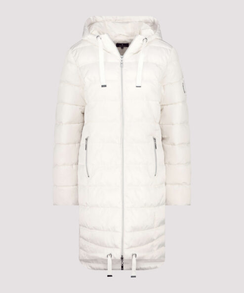 Ez a modern, steppelt kabát a kényelmet és a stílust ötvözi. A fényes lurex csíkok divatos kiegészítői, míg a húzózsinóros kapucni és a hosszított hátrész további védelmet nyújt. A normál szabás kényelmes, időtálló viseletet biztosít.