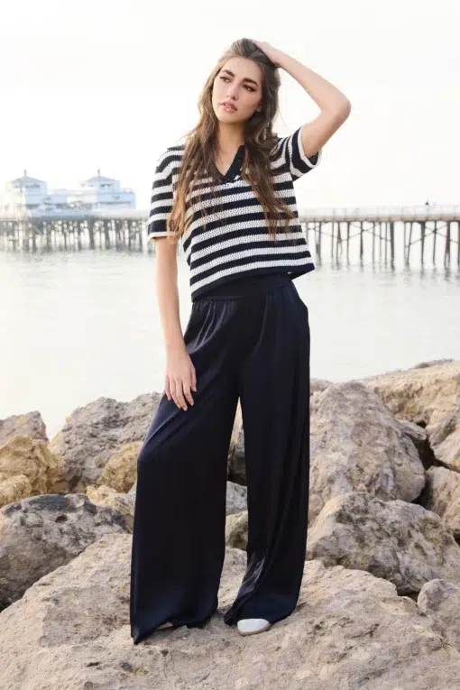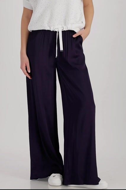 Elegáns Palazzo nadrág lenge, szaténhatású viszkózból, gumírozott derékkal és praktikus oldalsó zsebekkel a könnyed stílusért.