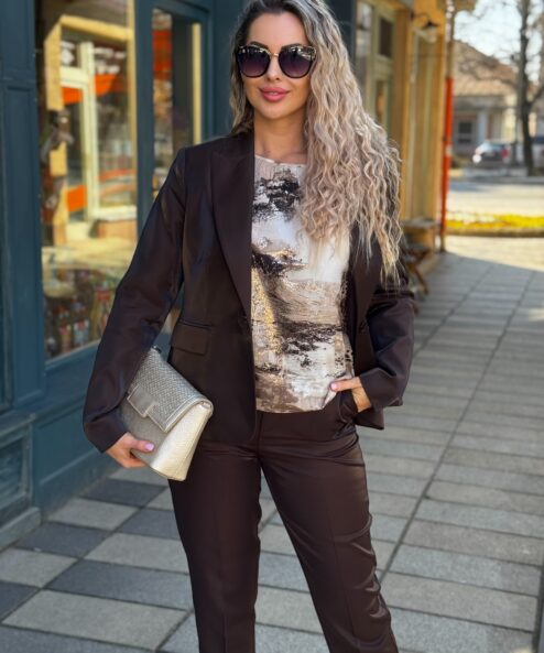 Ez a légies, 100% viszkózból készült blúz elegáns szavannamintával, lakk részletekkel és finom fodros díszítéssel kápráztat el, modern nőiességet kölcsönözve.