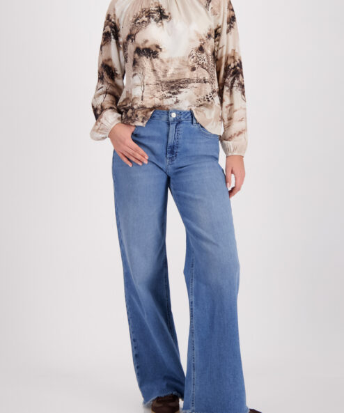 Ez a légies, 100% viszkózból készült blúz elegáns szavannamintával, lakk részletekkel és finom fodros díszítéssel kápráztat el, modern nőiességet kölcsönözve.