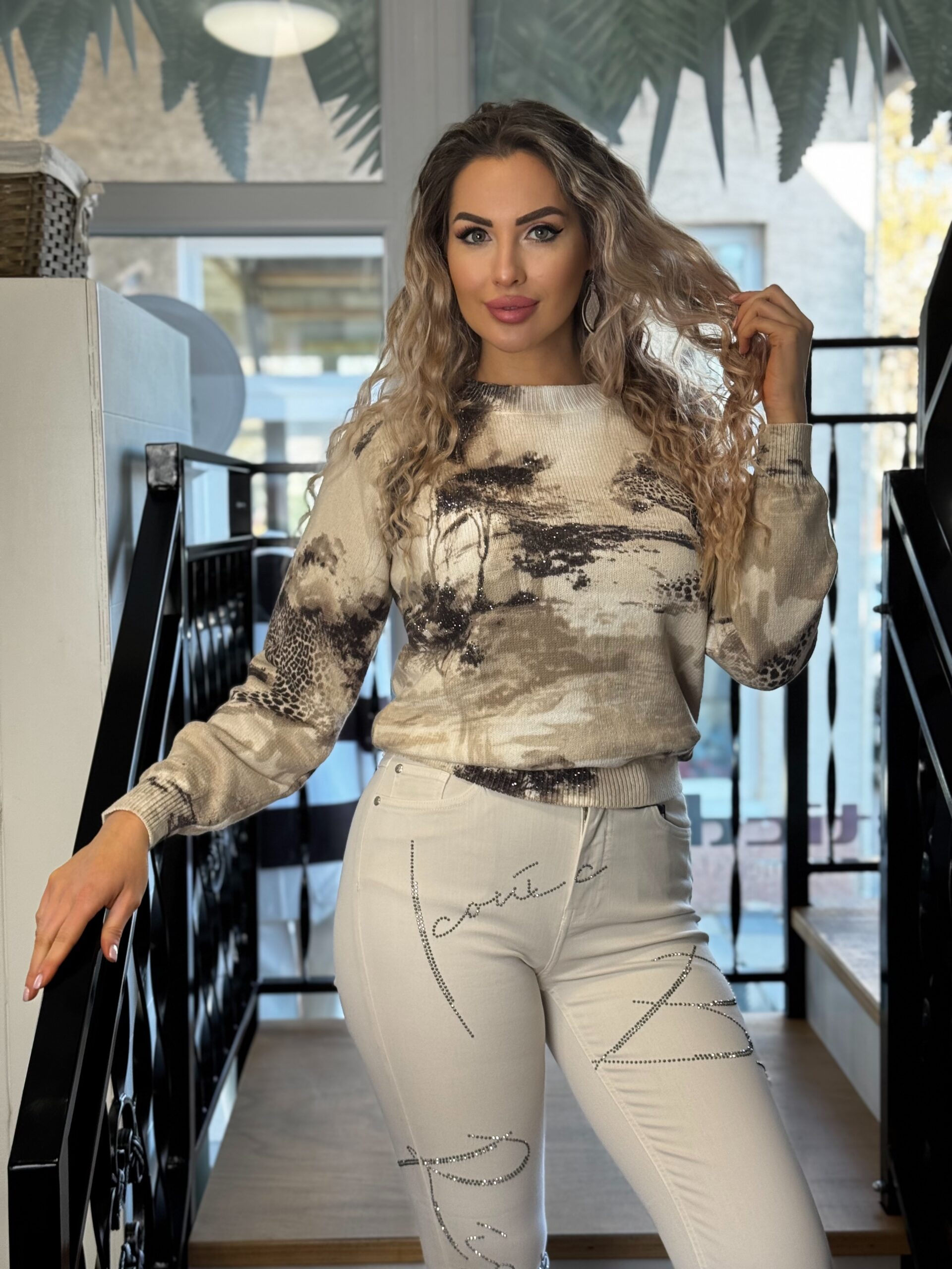 Ez a stílusos, 100% pamutból készült kötött pulóver elegáns szavanna mintával, csillogó strasszokkal és elegáns kerek nyakkivágással rendelkezik.