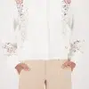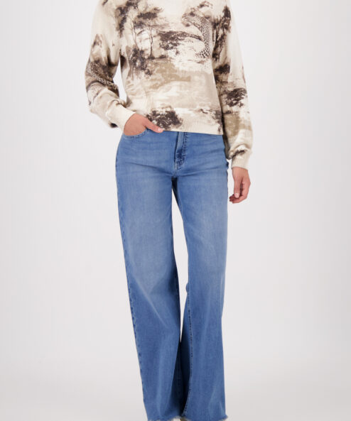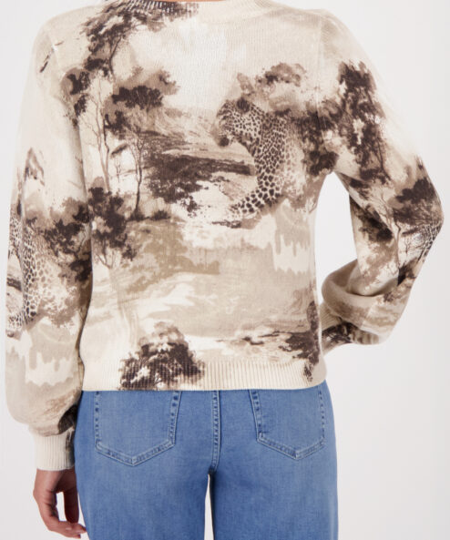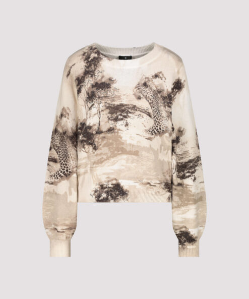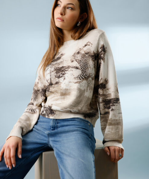 Ez a stílusos, 100% pamutból készült kötött pulóver elegáns szavanna mintával, csillogó strasszokkal és elegáns kerek nyakkivágással rendelkezik.