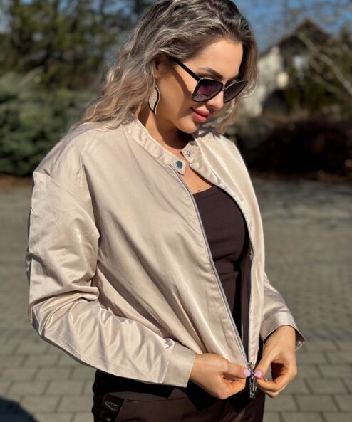 Stílusos tavaszi dzseki állógallérral, hullámos szegéllyel és elegáns cipzárral a modern megjelenésért.