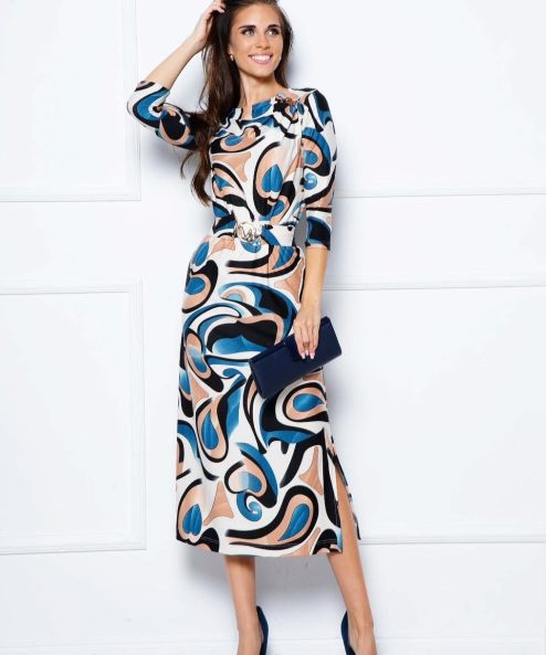 Nőies és elegáns darab az őszi kollekcióból – a Hédi kék mintás ruha kényelmes szabásával és különleges mintájával tökéletes választás mindennapokra és alkalmakra is.