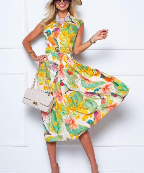 Friss, nyári hangulatú madár-virág mintás midi ruha átlapolt felsőrésszel és loknis szoknyával – nőies, kényelmes és figyelemfelkeltő választás minden alkalomra.