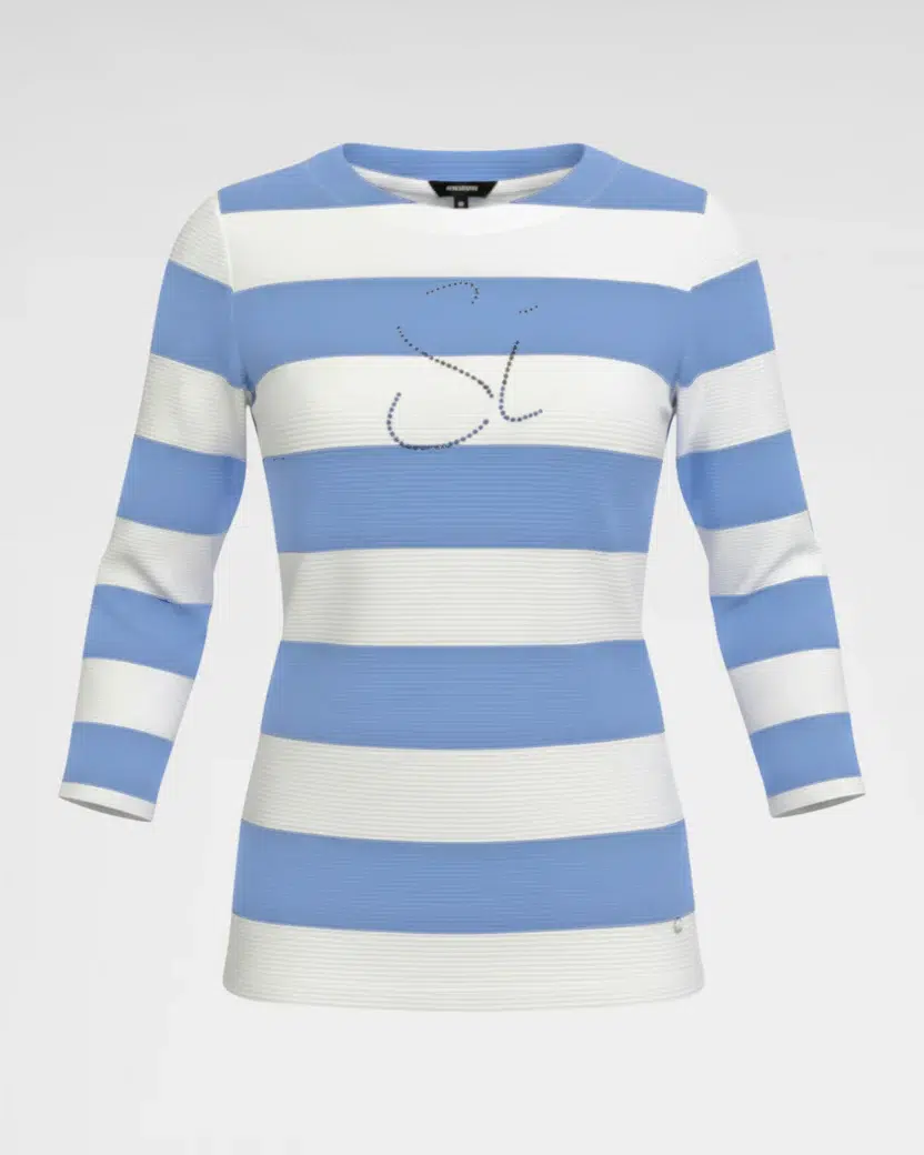 Ez a stílusos, 3/4-es ujjú női pulóver lenyűgöző minőségű ottomán textúrájával és divatos csíkos dizájnjával tűnik ki. A finom bordázat luxus érzetet kölcsönöz, míg a kényelmes szabásvonal kiemeli a nőies sziluettet. A visszafogott elülső minta elegáns hatást kelt, és igazi tekintetgyönyörködtetővé teszi ezt az inget.