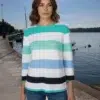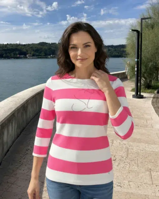 Ez a stílusos, 3/4-es ujjú női pulóver lenyűgöző minőségű ottomán textúrájával és divatos csíkos dizájnjával tűnik ki. A finom bordázat luxus érzetet kölcsönöz, míg a kényelmes szabásvonal kiemeli a nőies sziluettet. A visszafogott elülső minta elegáns hatást kelt, és igazi tekintetgyönyörködtetővé teszi ezt az inget.