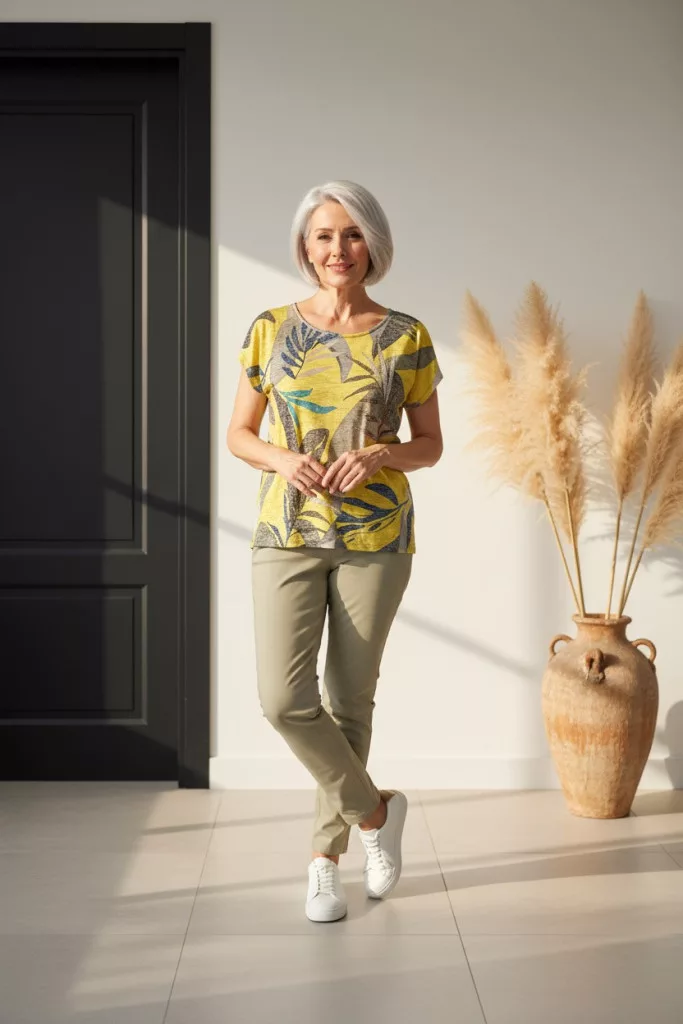 Navigazione keki-sárga levél mintás felső