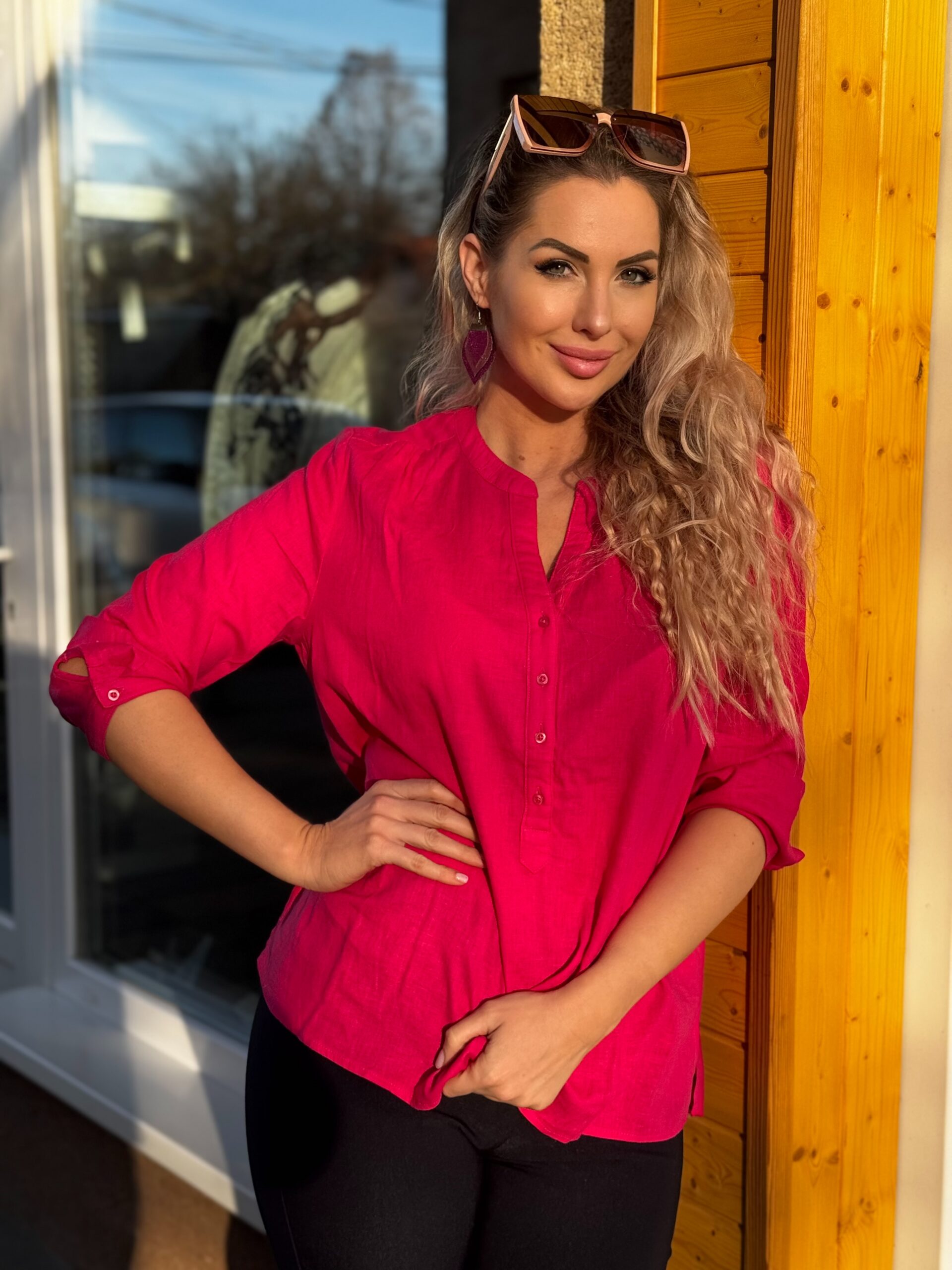 Ez a lenvászon tunika klasszikus stílusát pink árnyalatban mutatja be. A gombos gallér és a háromnegyedes ujjak sportos megjelenést kölcsönöznek. A hátul lévő passzé kiemeli a vállakat, míg az eleje könnyen behúzható. Párosítsd nyári nadrággal, szoknyával és szandállal egy divatos felfrissülésért!