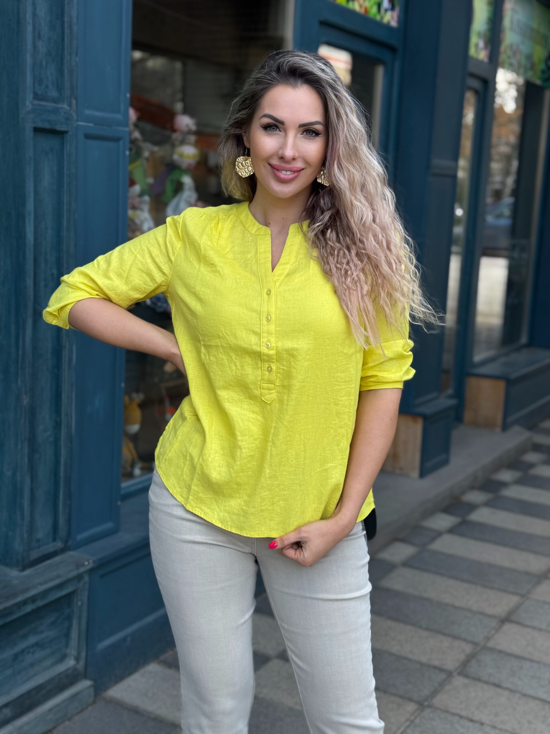 Ez a lenvászon tunika klasszikus stílusát sárga színben mutatja be. A gombos gallér és a háromnegyedes ujjak sportos megjelenést kölcsönöznek. A hátul lévő passzé kiemeli a vállakat, míg az eleje könnyen behúzható. Párosítsd nyári nadrággal, szoknyával és szandállal egy divatos felfrissülésért!