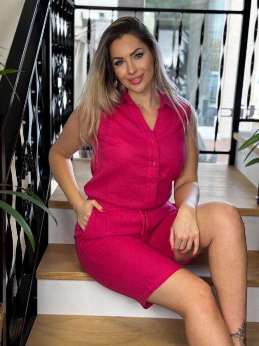 Ez a lenvászon blúz klasszikus stílusát pink árnyalatban mutatja be. A hátul lévő passzé kiemeli a vállakat, míg az eleje könnyen behúzható. Párosítsd nyári nadrággal, szoknyával és szandállal egy divatos felfrissülésért!