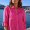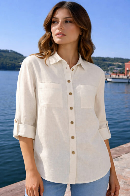 Fedezd fel a kényelem és az elegancia tökéletes kombinációját: Fehér női vászonblúzunk, kiváló minőségű, rugalmas anyagból, kényelmes érzetet és optimális mozgásszabadságot biztosít. A teljes hosszúságú ujjak lazán felhajthatók, míg a két praktikus mellzseb stílusos kiegészítő. Ideális szabadidős tevékenységekhez, irodába vagy nyári szettekhez – ez a blúz napsütéses csillogást kölcsönöz bármilyen megjelenésnek.