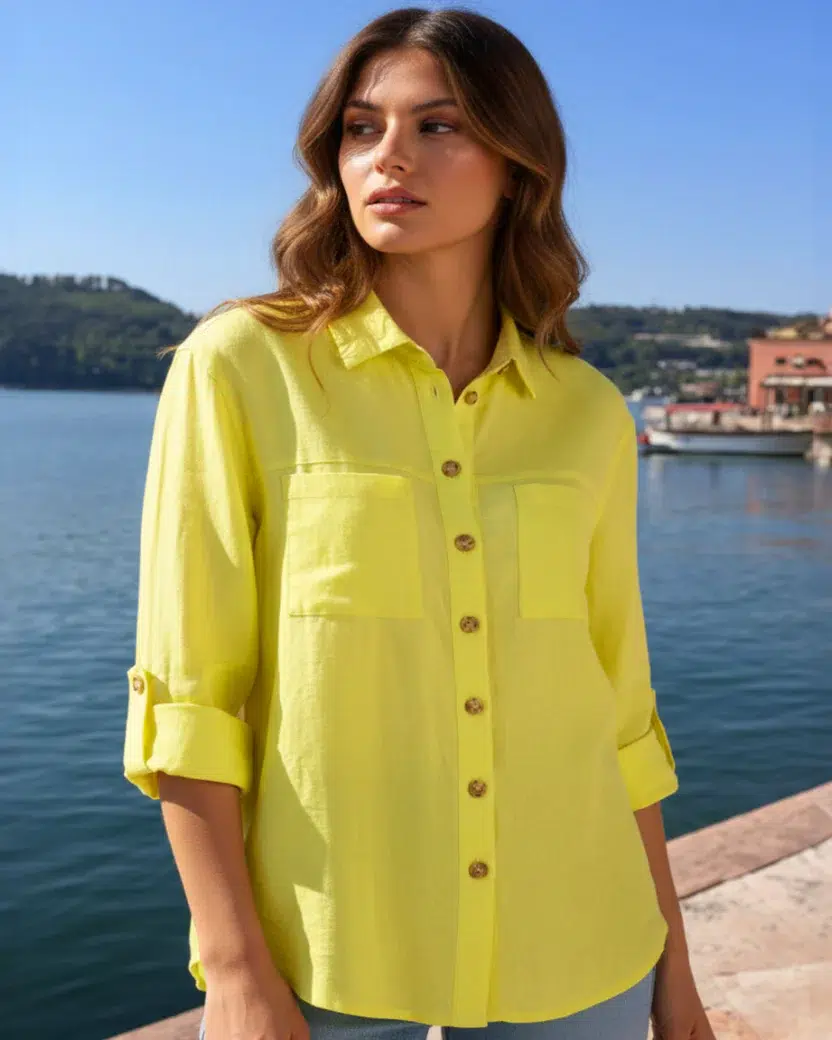 Fedezd fel a kényelem és az elegancia tökéletes kombinációját: Sárga női vászonblúzunk, kiváló minőségű, rugalmas anyagból, kényelmes érzetet és optimális mozgásszabadságot biztosít. A teljes hosszúságú ujjak lazán felhajthatók, míg a két praktikus mellzseb stílusos kiegészítő. Ideális szabadidős tevékenységekhez, irodába vagy nyári szettekhez – ez a blúz napsütéses csillogást kölcsönöz bármilyen megjelenésnek.