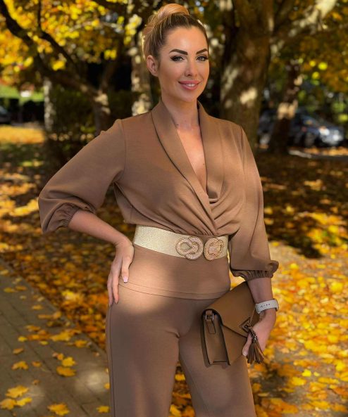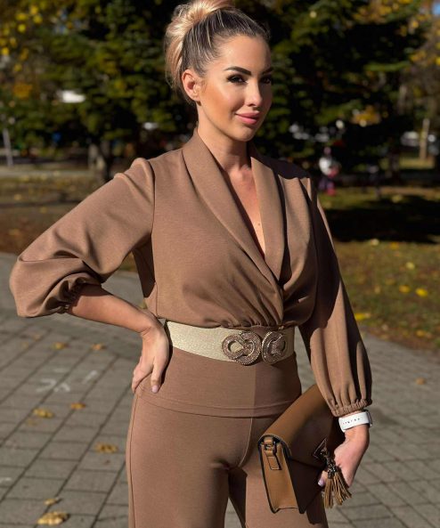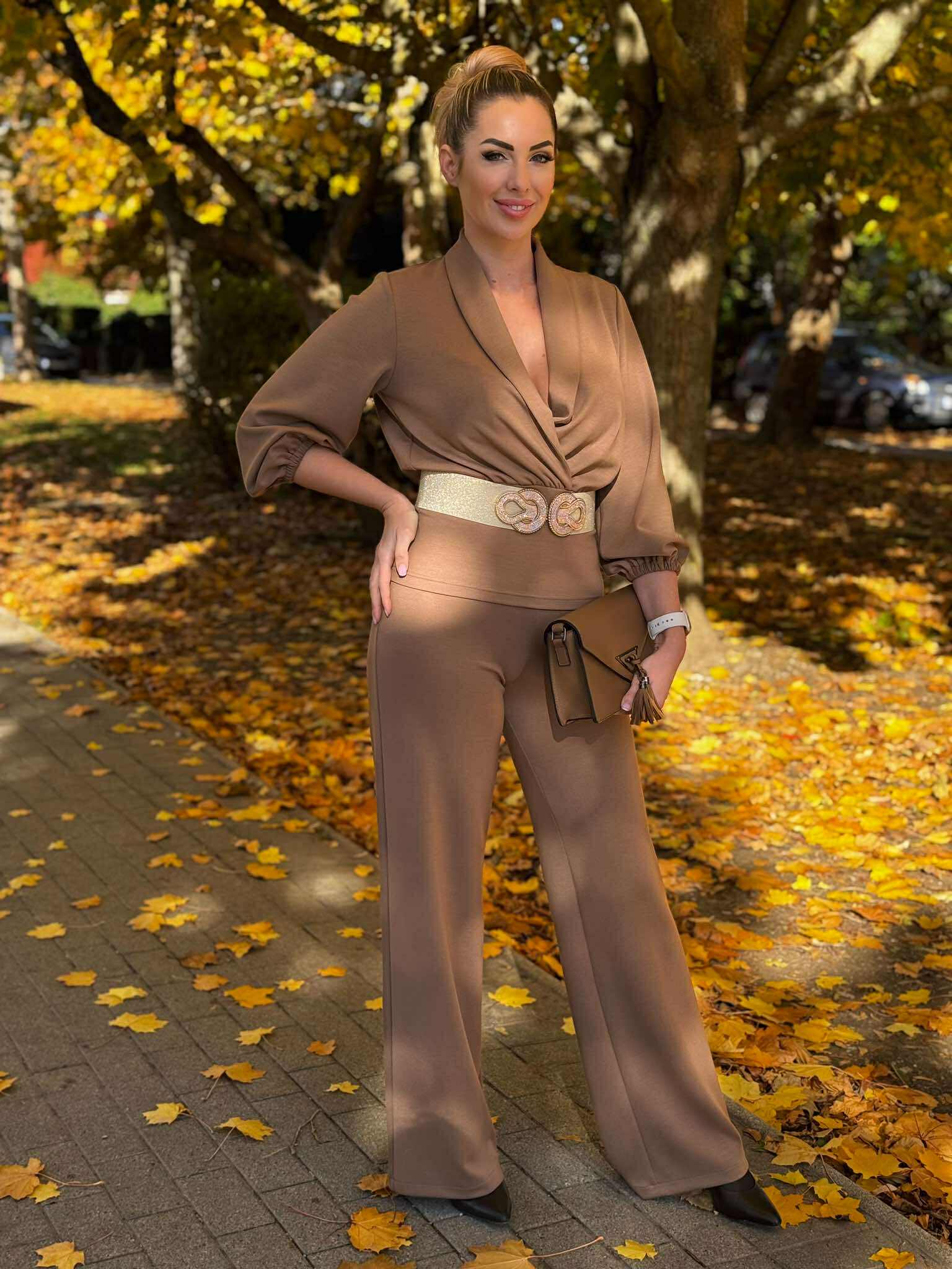 Átlapolt V nyakú kialakítás, amely nőies és elegáns megjelenést kölcsönöz