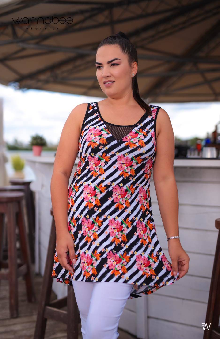 - “A” vonalú trikó 45 fokban csíkos mintázattal, elején áttört háló betéttel.