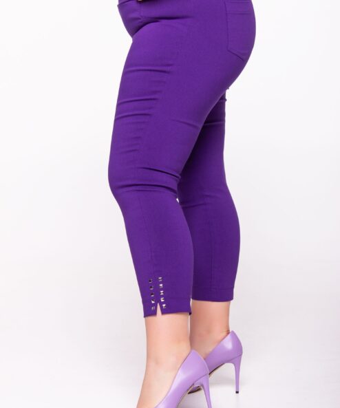 - Kényelmes, rugalmas bengalin anyagból készült, elöl álzsebekkel, hátul rátett zsebekkel, alján kis slicceléssel és szegecs jellegű díszítéssel.
