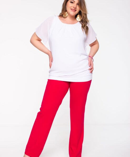 - Egyszínű muszlin felső színben hozzá hangolt trikóval, elején dekoratív rakásokkal.