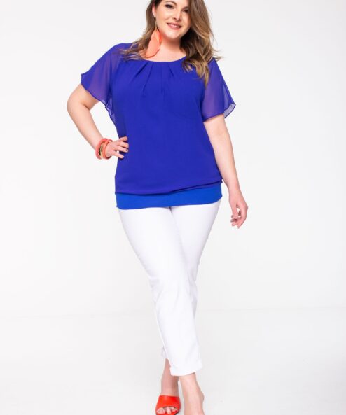 - Egyszínű muszlin felső színben hozzá hangolt trikóval, elején dekoratív rakásokkal.
